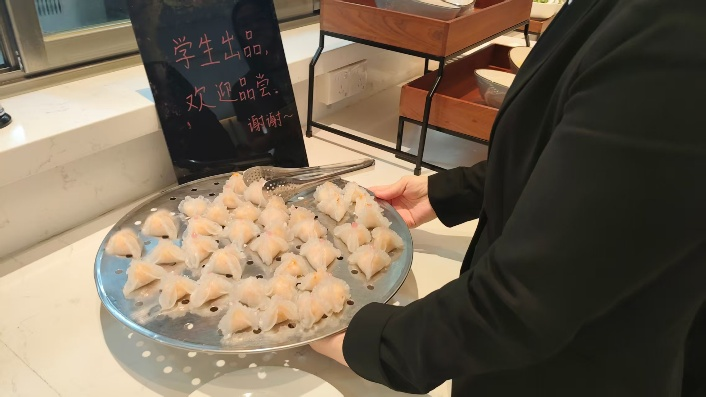 学生们的创新实践成果已在市场中崭露头角:小张团队设计的“桂花酒酿慕斯”借鉴非遗技艺,采用低脂奶酪制作,不仅荣获行业技能大赛银奖,更成为弘美餐厅的“隐藏菜单”;小李团队研发的“火龙果欧包”以新鲜火龙果汁调色,搭配全麦基底,因“健康颜值双高”成为客人拍照打卡的热门单品;还有造型憨态可掬的猪仔包、爆浆流心的流沙包,常常刚送抵餐厅就被点单。“以前上课只想着‘做对’,现在会主动思考‘客人喜欢什么’,这种转变特别有成就感。”小张说。